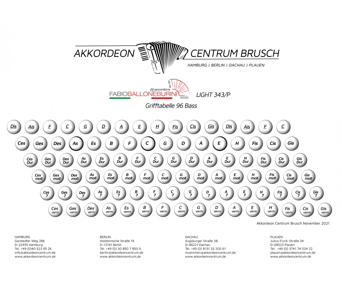 Sie suchen ein kleines leichtes Akkordeon, möchten aber trotzdem 96 Bässe und nicht nur 5 Klangfarben? Mit diesem neuen Instrument von Ballone Burini haben Sie es gefunden! Natürlich mit der bewährten ACB-Garantie inklusive Koffer und Riemen!