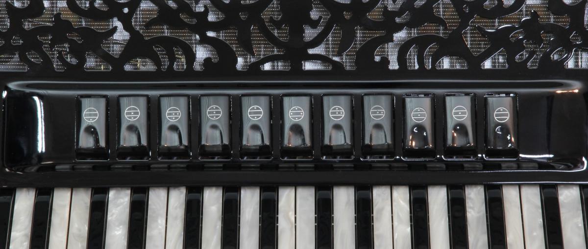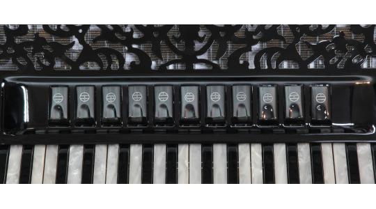 Hochwertiges leichtes Cassotto-Akkordeon mit handgemachten Stimmplatten! | Die A-Mano Stimmplatten sorgen für die beste Ansprache und geringsten Luftverbrauch. Zum schnellen Wechsel ins volle Register, ist die Cantonelli mit einem Mastertaster im Griffbrett ausgestattet. Im Bass sorgt ein großer Winkelstimmstock für einen vollen Klang und satte Ansprache der Grundbass-Stimmzungen. |